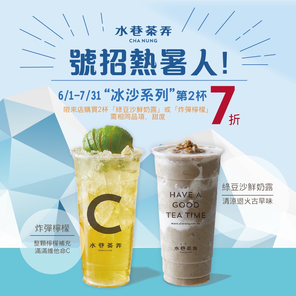 2020/6/1-7/31來店購買【炸彈檸檬】或【綠豆沙鮮奶露】享第2杯7折!!